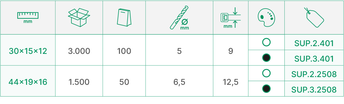 The Sup saddle-type mount is made of engineering plastic. It consists of a body with a central through-hole and two side guides at the ends of the head that allow application of the cable tie (maximum width 13 mm). The spacer ensures the cables are insulated with respect to the application surface.