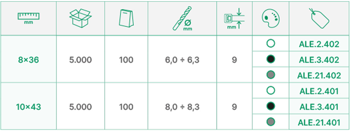 The Ale press-fit plug is made of engineering plastic. It consists of a body with press-fit support for anchoring to blind holes and a slotted head that rests on a spacer to allow application of the cable tie (maximum width 9 mm).