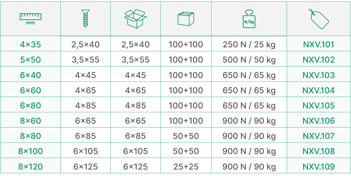CX series technical specifications with steel screw – Rounded head + TSP nail pozi drive