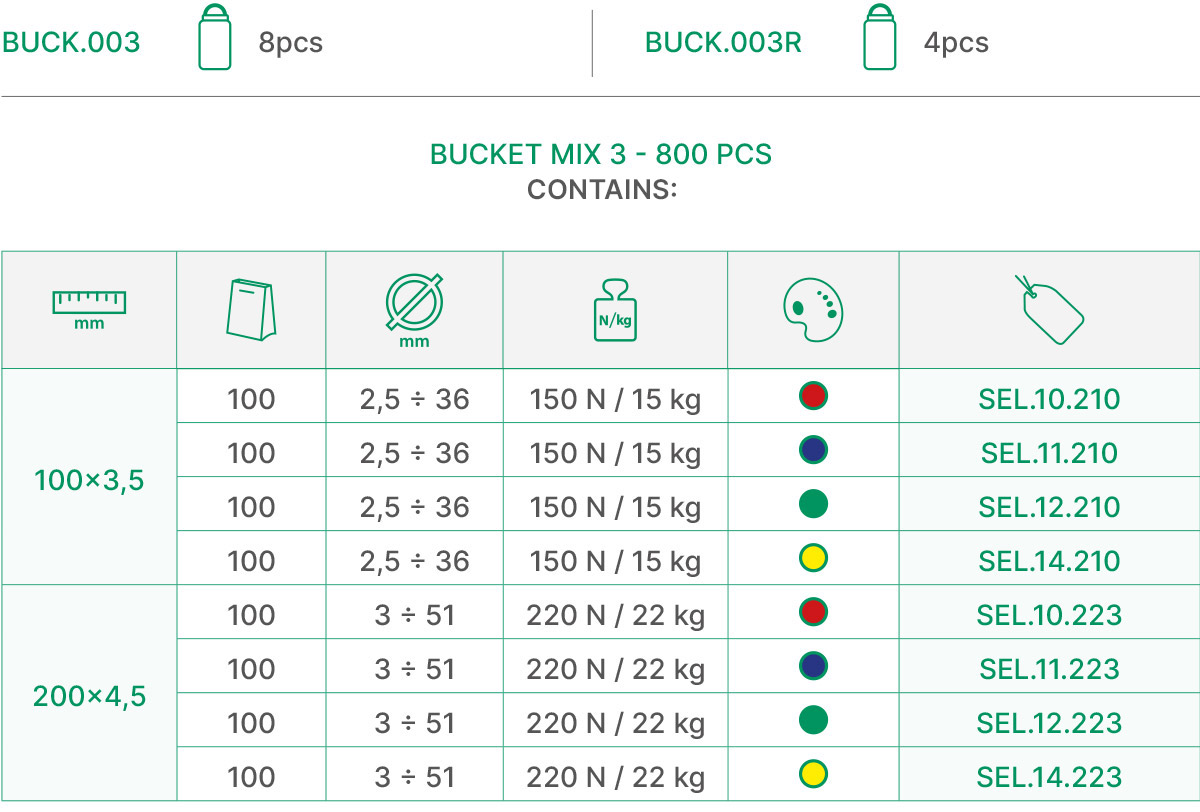 Selfit Bucket Mix is a bucket-shaped PET container available in two versions, containing either 1200 or 800 pieces. Contains an assortment of differently sized standard Selfit cable ties (colour: natural or black). The products are packaged in 100-piece sachets.