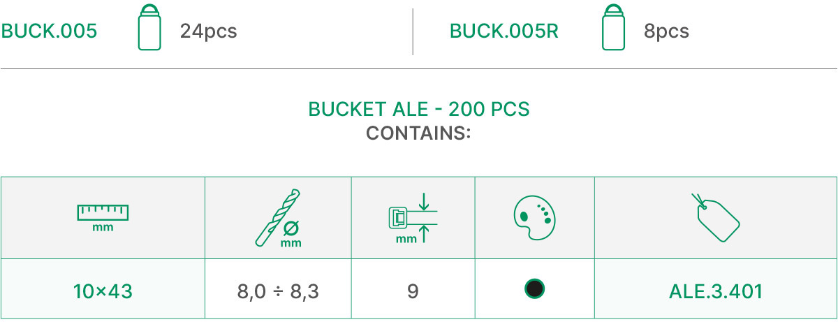 ALE Press-Fit Plug Bucket is a bucket-shaped PET container that holds 200 pieces. It contains Ale series press-fit plugs (10×43 mm) made of engineering plastic (colour: black).