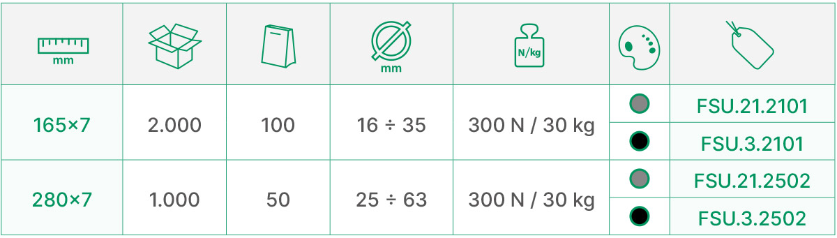 Fsu cable ties are made of self-extinguishing polyamide 6.6 (UL94:V2). They consist of a body with an internal rack with smooth rounded edges, a polyamide 6.6 tooth and a square head with a threaded through-hole (can be used with threaded plugs code ALF). Ideal for securing/supporting cable raceways.
